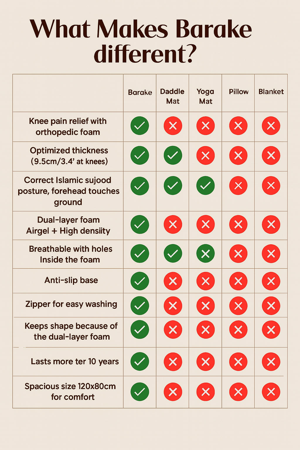 Targeted ergonomic support for your knees, helping to reduce pain during sujood and promote longer, more focused salah without discomfort.